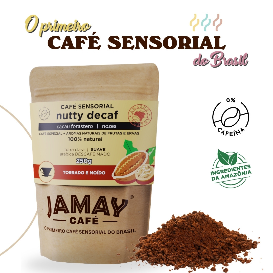E o que fizemos com isso? Criamos um produto que, mesmo sendo bem descafeinado, oferece sabor e prazer. Nosso Jamay® Nutty Decaf realiza isso, com notas de cacau forastero, nozes e ervas aromáticas, proporcionando uma sensação de suavidade e leveza para momentos de descanso e relaxamento.